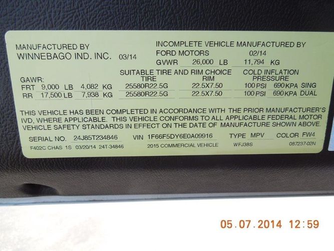Originally purchased new by UPMC, this unit began life as a 2015 Ford F53 Commercial Chassis, built 02/2014, powered by the proven 6.8L Triton V10 with a 26,000 lb GVWR, 9,000 lb front GAWR, and 17,500 lb rear GAWR. Tire spec is 255/80R22.5G on 22.5x7.50 rims, 100 PSI cold.